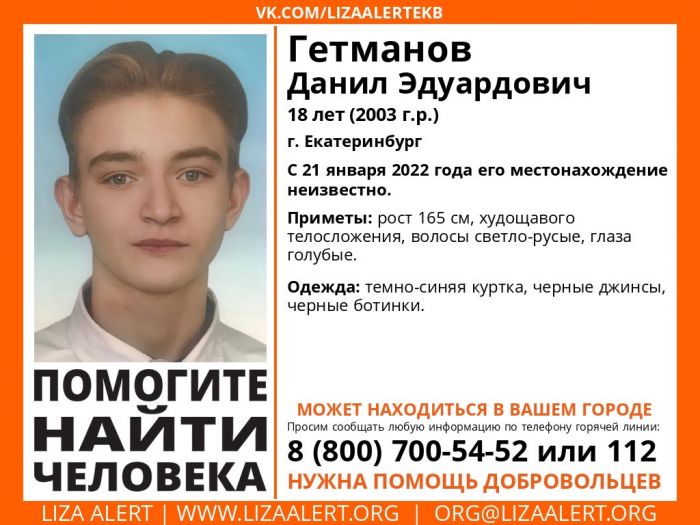 — В ОВД «Камышловский» в ходе оперативно-розыскных мероприятий был установлен водитель такси, который с Камышлова до Екатеринбурга довозил этого молодого человека с девушкой. После чего был установлен водитель такси, который довозил эту пару с Екатеринбурга до Кольцово, затем их местонахождение стало неизвестно. Были опрошены родственники и знакомые пары, благодаря чему появилась информация, что они поедут в Пермь. Если кто-то что-либо знает о пропавшем, пусть позвонит в дежурную часть по телефону 8 343 75 232 21, — сообщили в ОВД «Камышловский».