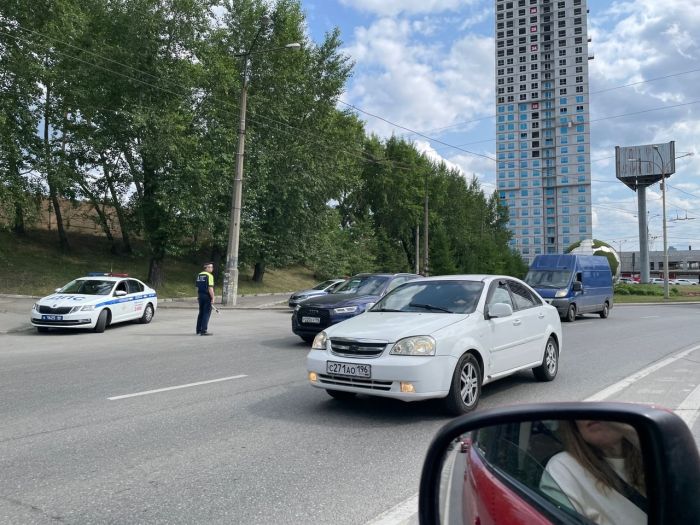 В начале проспекта Космонавтов (при повороте с Челюскинцев под мостом) в Екатеринбурге останавливают и проверяют все автомобили.