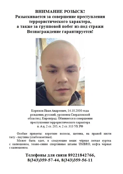 Разыскивается за совершение преступления террористического характера, а также за групповой побег из-под стражи Корюков Иван Андреевич*,