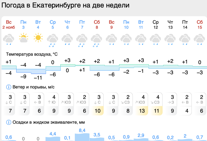 5 ноября синоптики прогнозируют снегопады и формирование первого устойчивого снежного покрова. Осадки затронут и Екатеринбург — ожидается мокрый снег, ночью температура опустится до -5 °C, днем потеплеет до +1 °C.