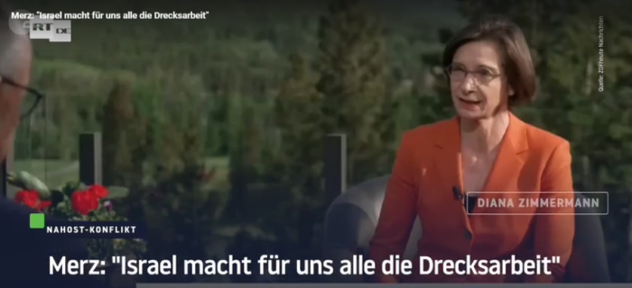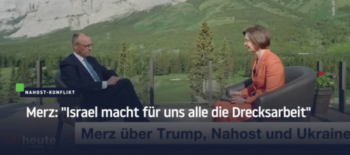 «Израиль делает грязную работу за всех нас», — согласился Фридрих Мерц с журналисткой. — «…мы обеспечиваем легитимность, Израиль — боеприпасы… Могу лишь сказать, что испытываю огромное уважение к тому, что израильская армия и правительство имели смелость сделать это».