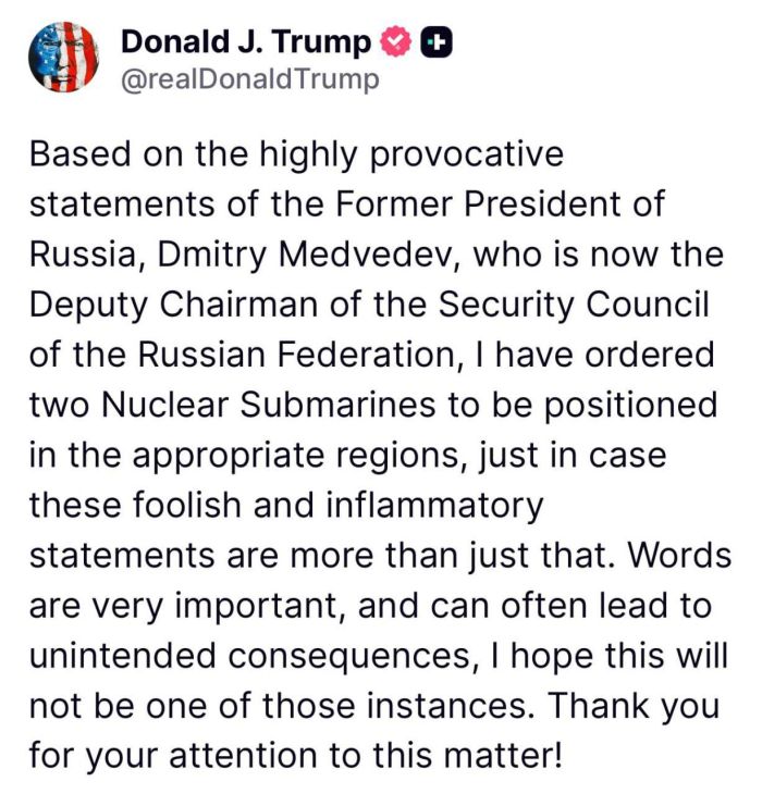 «Учитывая крайне провокационные заявления бывшего президента России Дмитрия Медведева, который сейчас занимает пост заместителя председателя Совета безопасности Российской Федерации, я распорядился разместить две атомные подводные лодки в соответствующих регионах — на случай, если эти безрассудные и подстрекательские слова окажутся чем-то большим. Слова имеют большое значение и часто могут привести к непреднамеренным последствиям. Надеюсь, в этот раз этого не произойдёт», — написал Дональд Трамп в своей соцсети Truth Social.