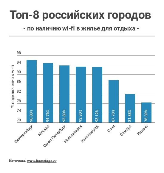 Лучше всего в России к Интернету подключен Екатеринбург. В уральской столице 96% квартир, сдаваемых туристам посуточно, имеют wi-fi. За столицей Урала следует российская столица: в Москве в 94,7% съемного жилья путешественники могут воспользоваться Интернетом. В топ-5 также вошли Санкт-Петербург (93,8%), Новосибирск (93,3%) и Калининград (93,12%).