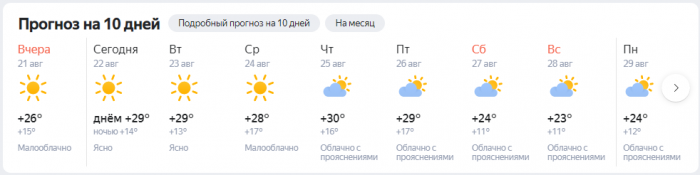 Завтра, 23 августа, также переменная облачность, без осадков. Ночью: 13-15. Днём: 28-30. Ветер неустойчивый слабый.
