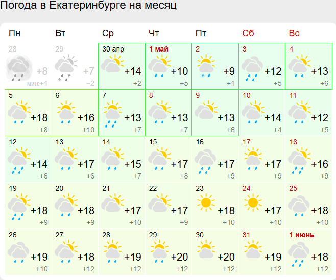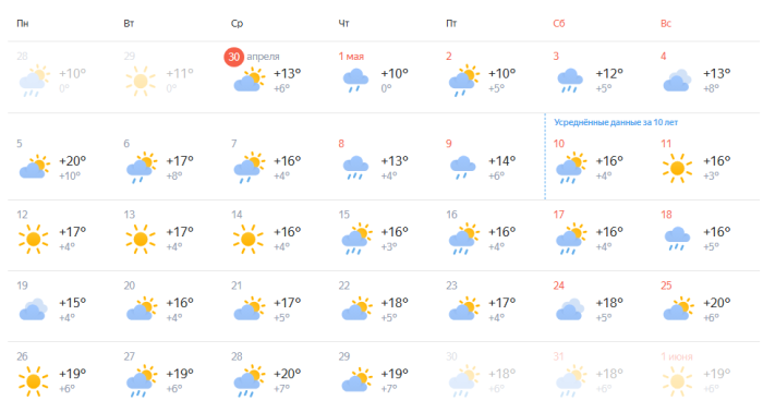 По данным Гидрометцентра России, средняя месячная температура воздуха в мае ожидается около нормы (норма +8-12°С). Месячная сумма осадков предполагается около и больше нормы (норма 40-60 мм).