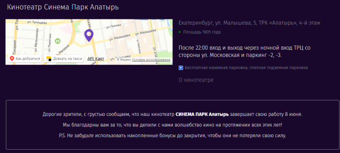 — Дорогие зрители, с грустью сообщаем, что наш кинотеатр «Синема Парк Алатырь» завершает свою работу 8 июня. Благодарны вас за то, что вы делили с нами волшебство кино на протяжении всех этих лет! — сообщается на сайте организации.