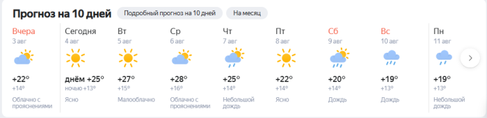 7 августа переменная облачность, без осадков, на севере местами кратковременные дожди. Ветер восточный 4-9 м/с. Температура воздуха ночью +10-15°С, днем +22-27°С.