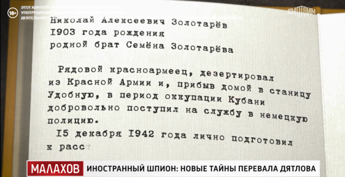 Это дало расследователям «тайны перевала Дятлова» новую версию — что в поход со студентами в действительности отправился не Золотарев, а похожий на него внешне сотрудник КГБ. В качестве экспертов этой версии в студию были приглашены историки спецслужб Андрей Ведяев и Николай Долгополов.