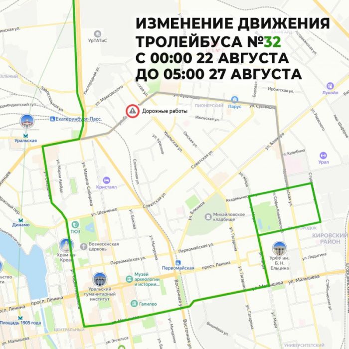 Так, с 00:00 22 августа до 05:00 27 августа меняют свой путь трамваи, а троллейбусы — с 00:00 22 августа до 05:00 1 сентября.