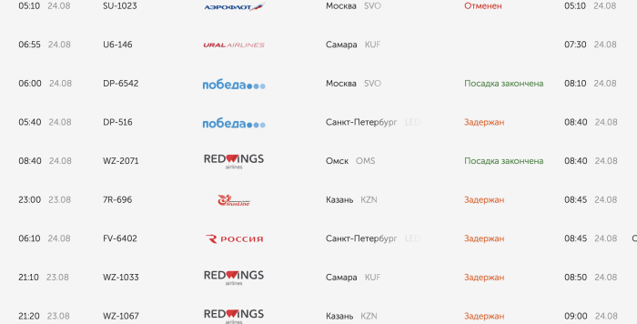 Рейс Red Wings в Самару задерживается на 5,5 часов. Еще два рейса этой авиакомпании — в Нижний Новгород и Казань — перенесены с 21:20 23 августа на 02:00 следующего дня. Самолет «России» в Санкт-Петербург также отправится с задержкой более чем на пять часов.