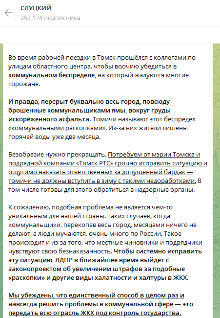 — Мы убеждены, что единственный способ в целом раз и навсегда решить проблемы в коммунальной сфере — это передать всю отрасль ЖКХ под контроль государства, — написал Слуцкий в своем Telegram-канале.