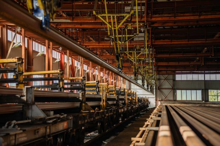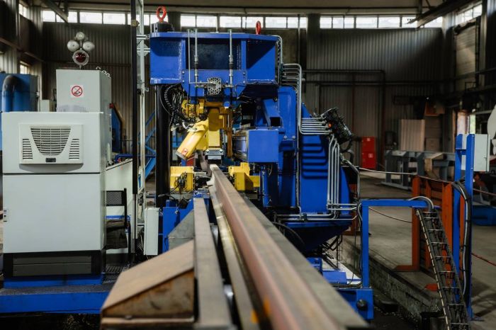 Сварка 100-метровых рельсов на двух линиях. Завод РСП-М может производить до 650 километров сварных плетей в год. Каждый 100-метровый рельс весит 6,5 тонны.