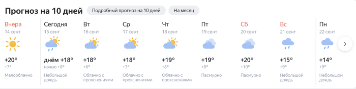 Так, 15 сентября — переменная облачность, осадков не ожидается. Ночью местами возможен туман. Ветер северо-западный 2-7 м/с. Температура ночью +5…+10 °С, местами заморозки до -2 °С. Днем воздух прогреется до +16…+21 °С.