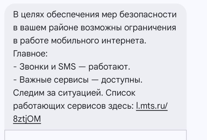 — В целях обеспечения мер безопасности в вашем районе возможны ограничения в работе мобильного интернета. Звонки и смс работают, важные сервисы доступны. Следим за ситуацией, — сообщается в рассылке.