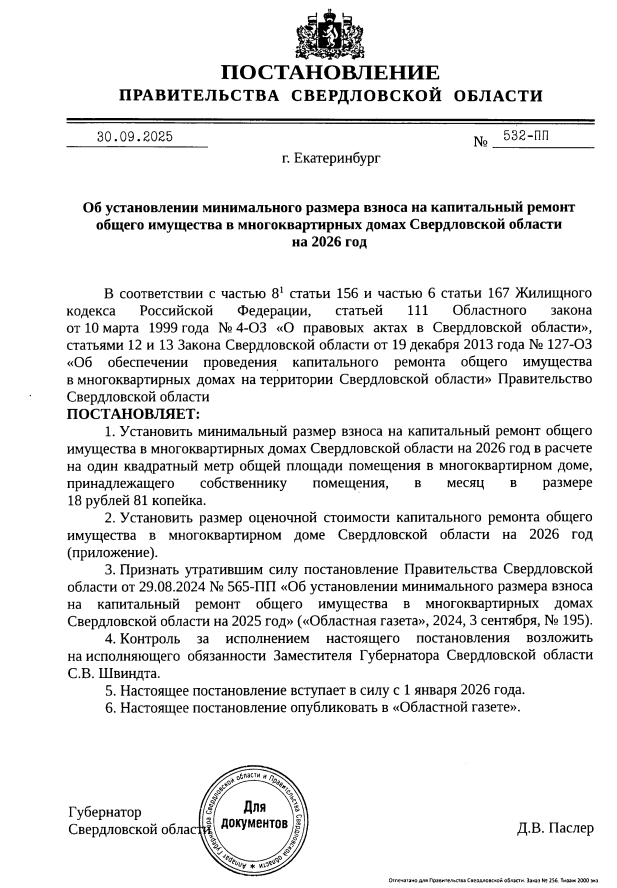 В Свердловской области повысили размер взноса на капитальный ремонт в многоквартирных жилых домах. Ставка с 1 января 2026 года составит 18,81 рубля за квадратный метр общей площади. Соответствующее постановление опубликовано на официальном портале правовой информации.