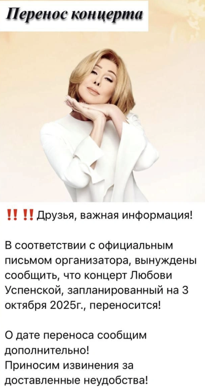 — В соответствии с письмом организатора вынуждены проинформировать, что концерт переносится, — говорится в сообщении.