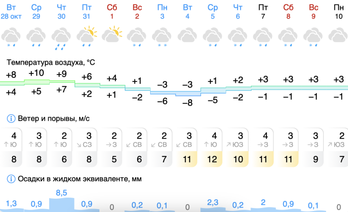 Главный синоптик Урала Галина Шепоренко уточнила, что с 29 по 31 октября в городе пройдут дожди, ночью температура будет около +4 °C, днём — до +7 °C. С 31 октября начнётся приток холодного воздуха в тыл циклону, после чего температура постепенно пойдёт на спад.