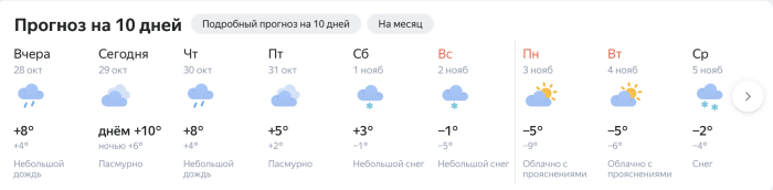 Холодный атмосферный фронт придет в регион с севера уже к концу недели. В ночные часы температура будет колебаться от -4 до -10 °C, днем воздух прогреется лишь до -2 … +3 °C. На дорогах местами возможна гололедица, ожидаются слабый снег и северный ветер порывами до 12 м/с.