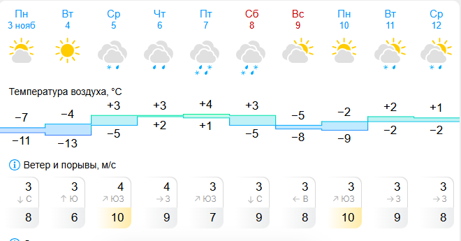 - Воскресенье, 9 ноября: ночью -5, днем -2