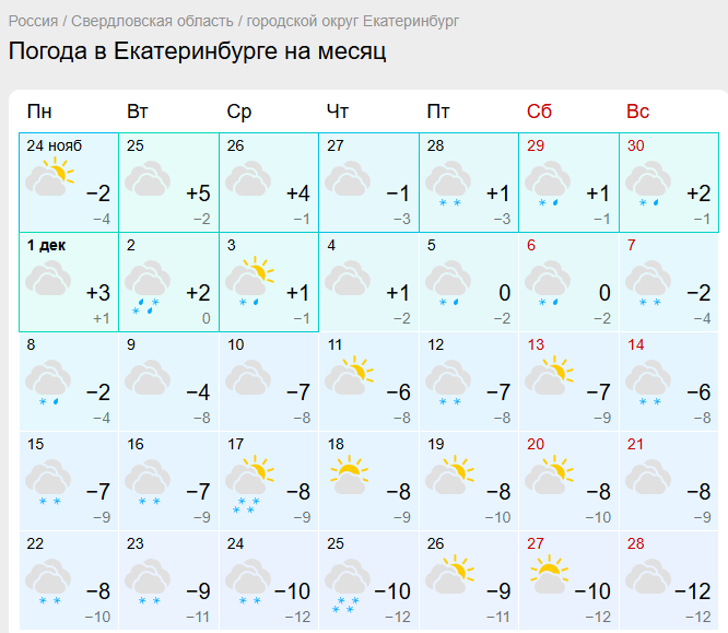 По прогнозу, температура будет опускаться плавно. Так, в первые десять дней столбики термометров не опустятся ниже -8 градусов. Во второй декаде Средний Урал засыплет мощным снегопадом, в это же время установится стабильная отрицательная температура. В конце месяца, наконец, придут небольшие морозы до -12 градусов, отмечает Ura.Ru.