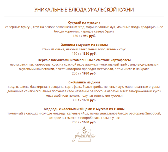 Ресторан позиционировал себя, как место, в котором подают блюда уральской кухни.