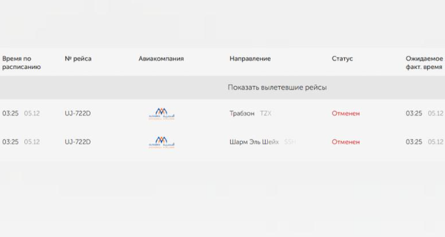 По неизвестным причинам отменены вылеты самолетов в Трабзон (Турция) и в Шарм-эль-Шейх (Египет). Рейсы были совмещенными, вылет был запланирован на 03.25. Маршруты обслуживает авиакомпания AlMasria Airlines.