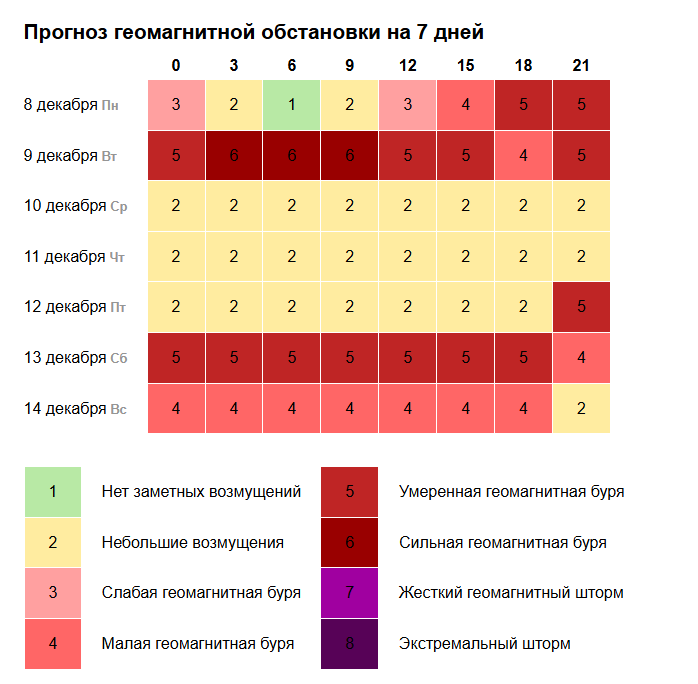 Так, 8 декабря 2025 года ожидается мощный геомагнитный шторм, сила колебаний геомагнитного поля достигнет пяти баллов. А к 9 числу уже и 6 баллов.