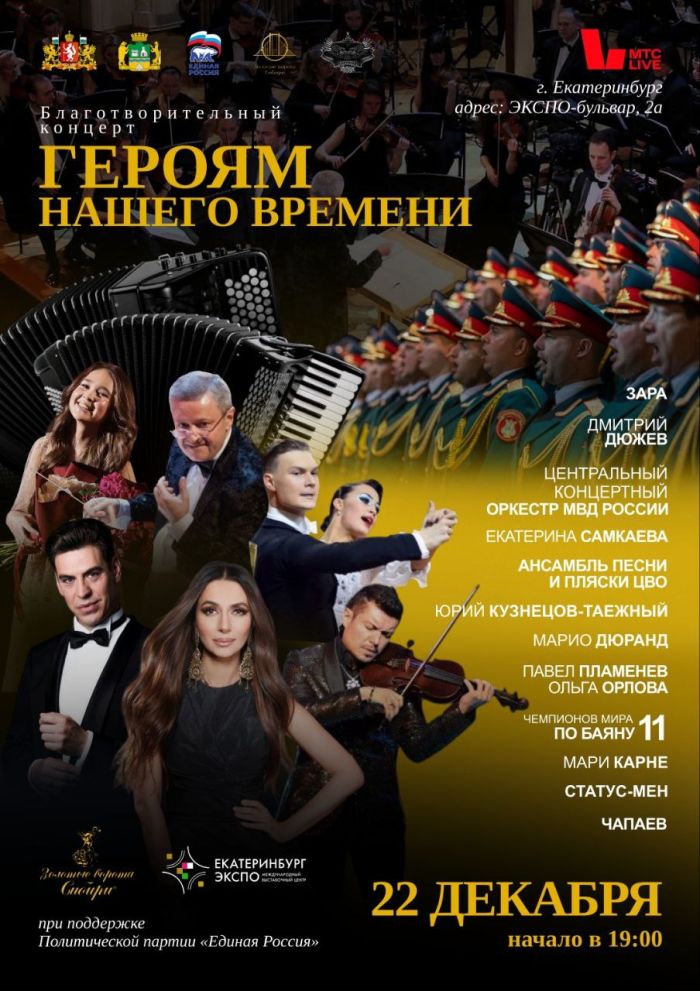 Юбилейный, 25-й концерт федерального благотворительного проекта «Героям нашего времени» в главном зале екатеринбурского конгресс-центра (ЭКСПО-бульвар, 2а) проведет благотворительный фонд «Золотые ворота Сибири». Концерт состоится 22 декабря 2025 года в 19:00.