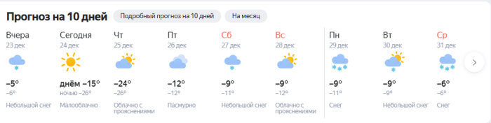 26 декабря облачно с прояснениями, преимущественно без осадков. Ветер юго-западный 3-8 м/с. Температура ночью -27,-32°С, на крайнем севере до -37°С, днем -14,-19°С, на севере до -24°С.