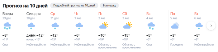 2 числа облачно с прояснениями, местами небольшой снег. Ветер ночью юго-западный 3 8 м/с, днем слабый. Температура ночью -12,-17°С, на севере 19,-24°С, днем -9,-14°С, на севере до -19°С.