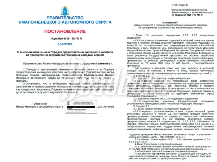 С 1 января в ЯНАО вступили в силу новые правила программы жилищного капитала (получения жилищного сертификата — прим. Uralweb) для молодых семей, сообщает Readovka.