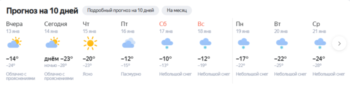 Завтра, 15 января, переменная облачность, без осадков, изморозь. Ветер юго-восточный 2-7 м/с. Температура ночью -28,-33°С, на юго-западе до -23°С, на востоке до -38°С, днем -19,-24°С, на юго-западе до -14°С.