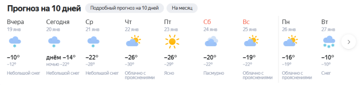 22 января облачно с прояснениями, без осадков. Ветер северо-восточный 1-6 м/с. Температура ночью -32,-37°С, на севере и востоке до -42°С, днем -27,-32°С, при прояснении до -22°С.