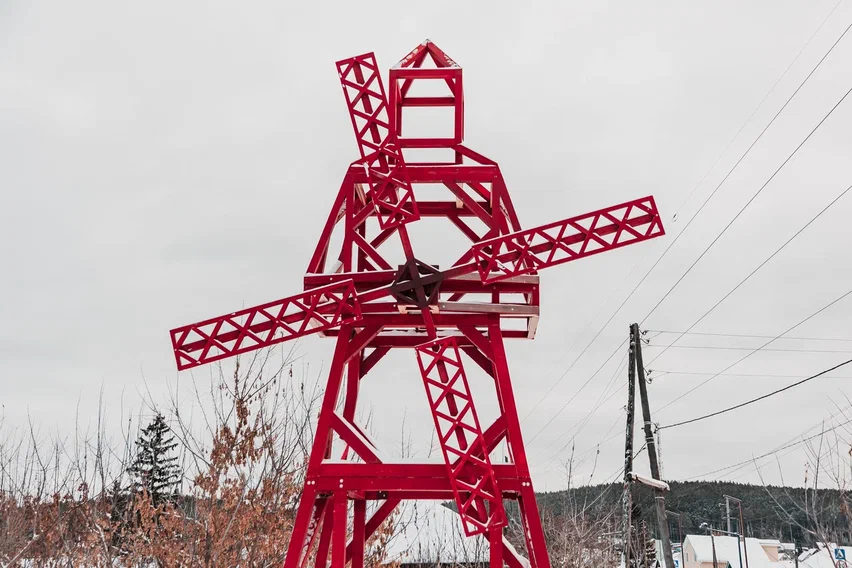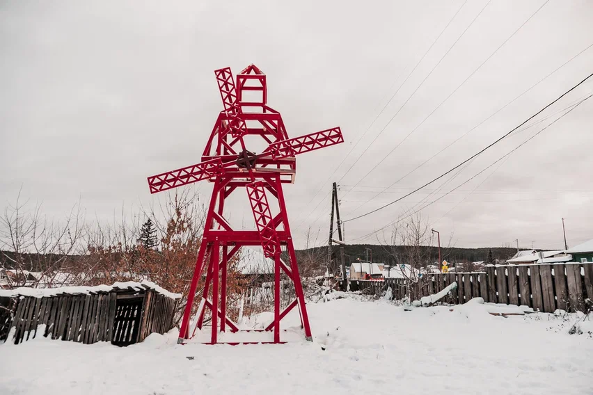 Корпус красной мельницы одновременно напоминает фигуру красноармейца, а также вызывает ассоциации с временами революции и Гражданской войны, которая перемолола судьбы многих людей и на Урале.