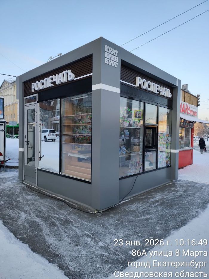 — Вот как выглядят новые киоски «Роспечати», которые уже начали ставить в Екатеринбурге на тех местах, где они могут стоять. Этот — на углу 8 Марта — Большакова.