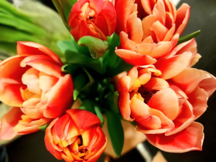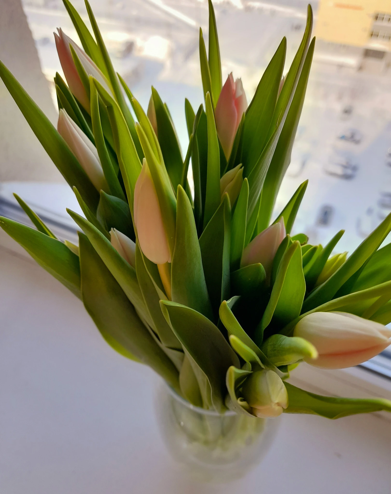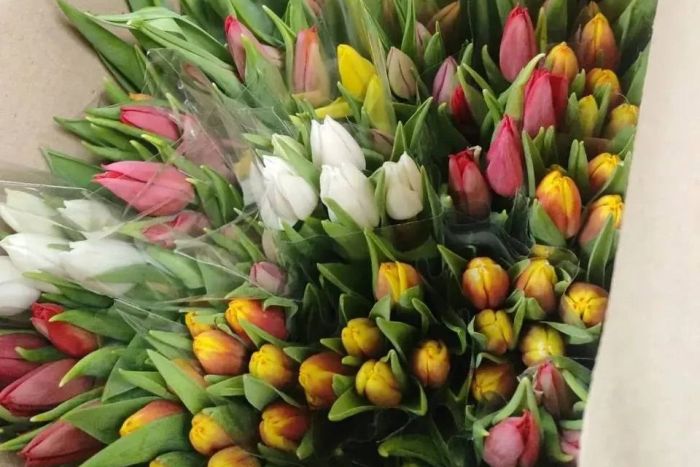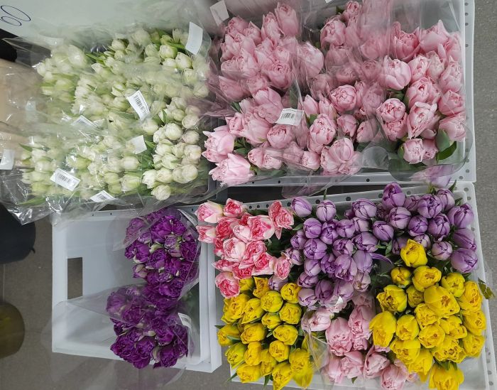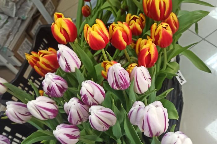 В магазинах «Перекрёсток» тюльпаны небольшие — стебель 40 см и бутон до 5 см. Цена за цветок — 80 рублей. Букеты по 15 штук.