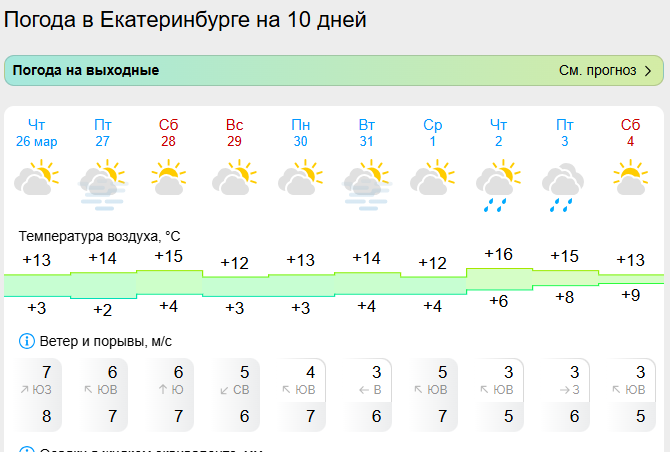 28 марта (сб): ночью +6°C, днем +17°C;