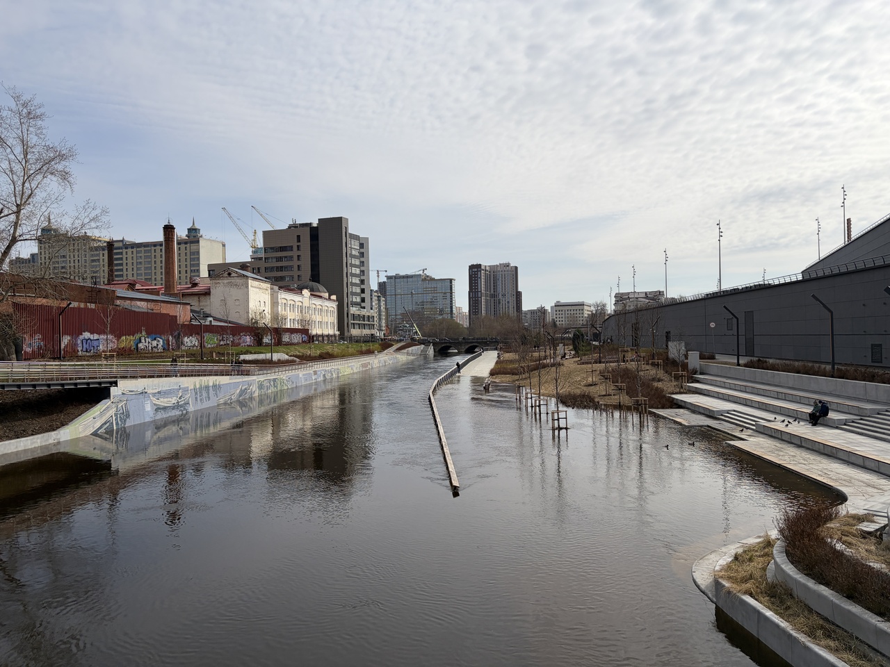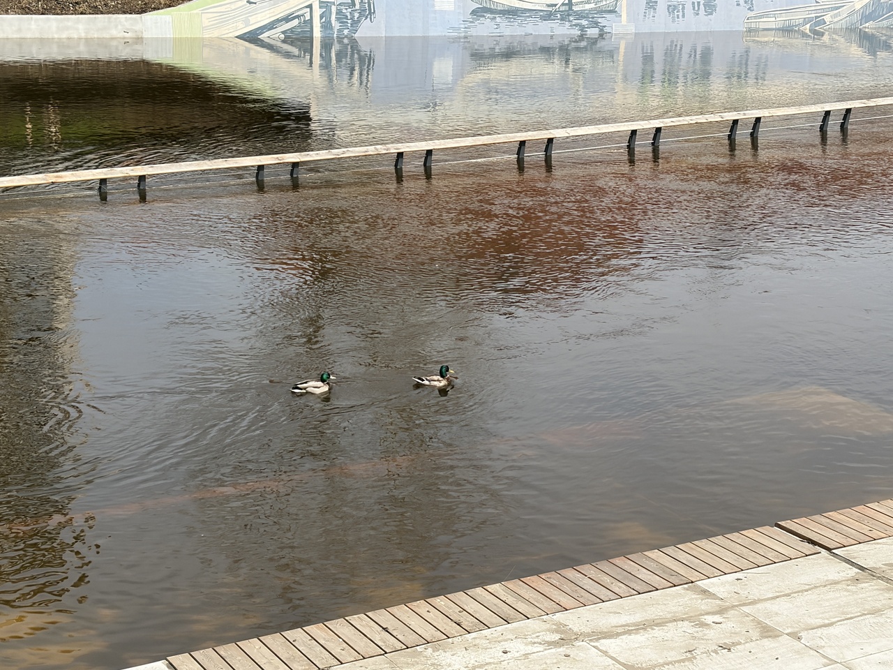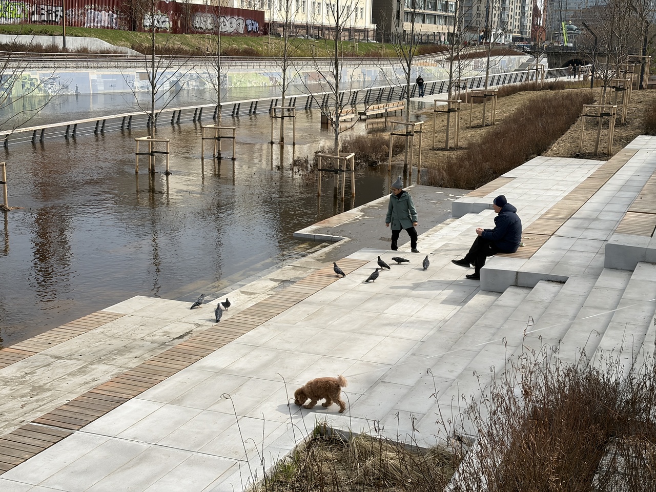 В Екатеринбурге набережную около УГМК-Арены продолжает подтапливать. На сегодняшний день, 8 апреля, уже не видны нижние ярусы дорожек. Также в воду погрузились некоторые деревья.