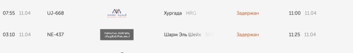 На данный момент, согласно онлайн табло, задерживается несколько рейсов в Египет.