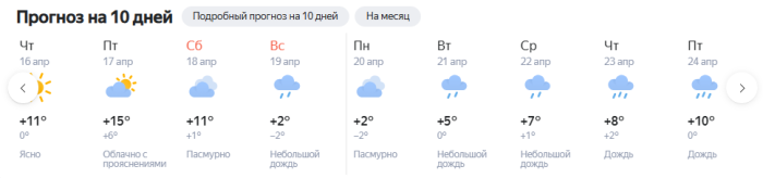 17 апреля (пт): ночью +2 °C, днём +16 °C