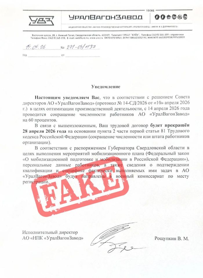 — Сотрудники завода оперативно выявили признаки подделки: неверный бланк, некорректные инициалы и подпись, а также регистрационные номера письма не из той оперы и явно не соответствуют внутреннему документообороту, — отметили в пресс-службе УВЗ.