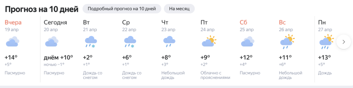25 апреля (суббота): ночью +3 °C, днем +13 °C, переменная облачность.