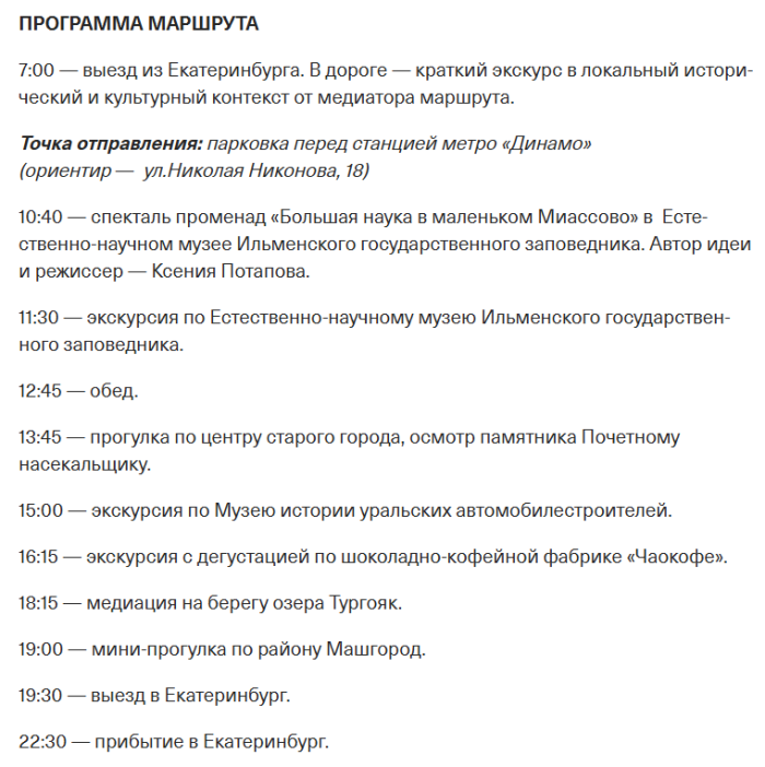 Можно будет увидеть живописные виды одного из самых красивых озёр Южного Урала, которое часто называют «маленьким Байкалом», а также попробовать шоколад и кофе собственного производства на фабрике «Чаокофе» и узнать, как создаются легендарные грузовики «Урал».