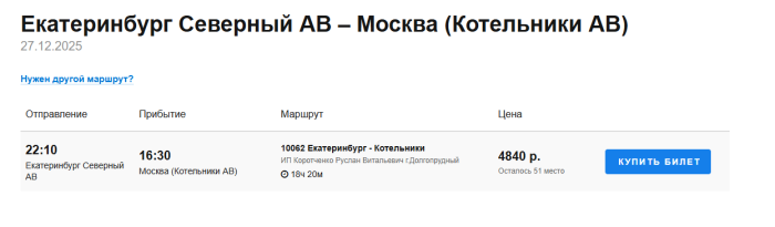 С автовокзала «Северный» автобус будет отправлять в 22:10, а прибывать на автовокзал «Котельники» в Москву — в 16:10 следующего дня. Первый рейс запланирован на 27 декабря.