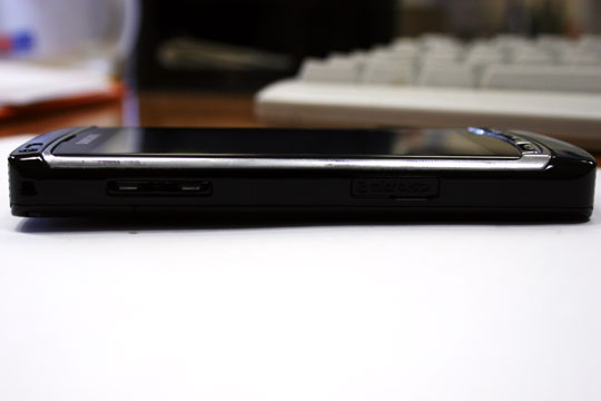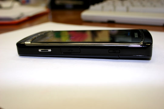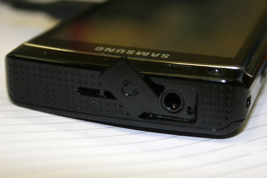 На верхнем торце – разъем для hands free. Причем все разъемы закрываются пластиковыми «крышечками». Обычно они быстро теряются, но аппарат пробыл у нас не так долго, так что убедиться в этом не было возможности.
