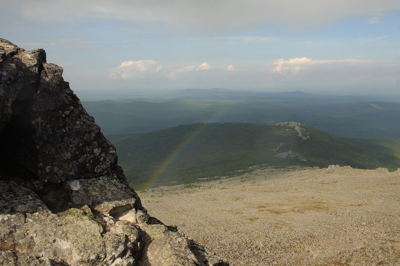 На вершине мы застали радугу, но так как погода в горах меняется стремительно, радуга исчезла за считанные минуты.
