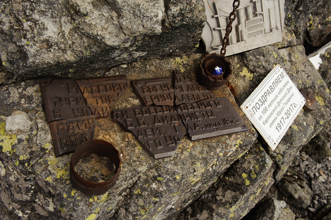 Вершина отмечена знаком, чуть ниже находятся таблички, установленные туристами.